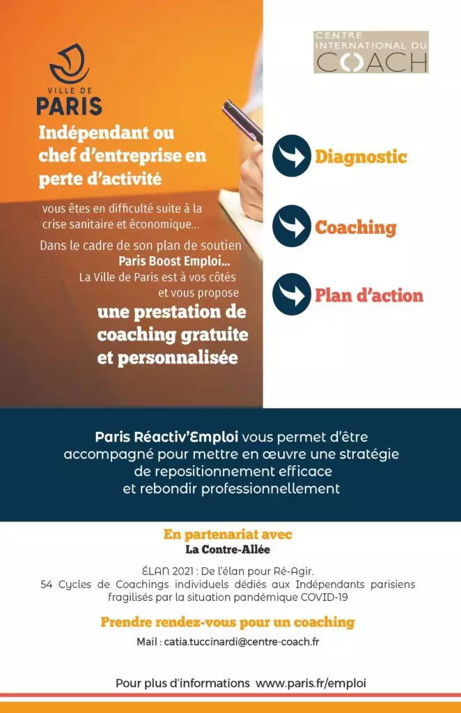 Catia Tuccinardi Gouyette et le CIC-Centre International du Coach sont l’un des lauréats de l’appel d’offre « Paris Réactiv’Emploi 2021 » lancé par la ville pour offrir une prestation de coaching personnalisée à des indépendants ou chefs d’entreprise parisiens fragilisés par la crise sanitaire et économique.